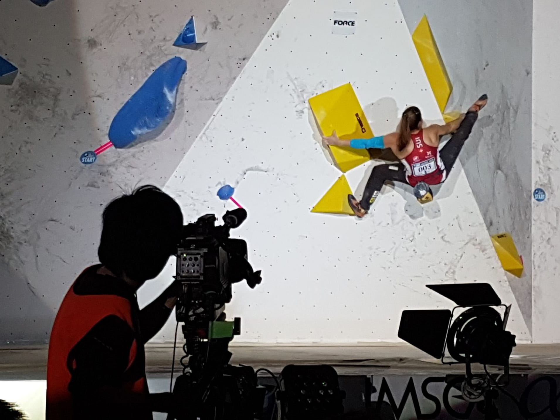 During the qualification swiss climber Petra Klingler found a tricky beta for the last boulder problem. She pulled hard on a crimp with here left arm. While the forearm was rotated she heard a popping sound and felt pain as well as tingling sensation. It would not be Petra if she would let go at that moment… good or not… After a brief check I knew that the neurological status is ok. By triggering the flexor muscles the tingling sensation could be solved. Later on with more time to examine her it turned out that she had a partial rupture of a side ligament on the elbow. Petra was qualified and very psyched to start in semifinal. Taking the higher risk of damaging the ligamentous structure even more, I prepared her as good as possible. That means applying a tape to support her elbow. Well the story continues. After making it in to finals, it was quite a task for me. Because of course there was no doubt that she wants to climb in finals. It was a tough call. I would never decide in such a situation. But I have to guide in a way. That means, we had another talk, check and an even stronger tape than in the round before. And it worked! I have to say that luckily I know Petra already better than most athletes (if not from Austria) because she has seen me in the Therapierbar (my clinic) a few times already. That made our work together and the whole process much easier. When you look at the pic of her in finals, you don´t see the strong supportive part of the tape because I covered it with some kinesiological tape. This was the tape bandage which supported her joint but allowed her to almost bend and extend normal.