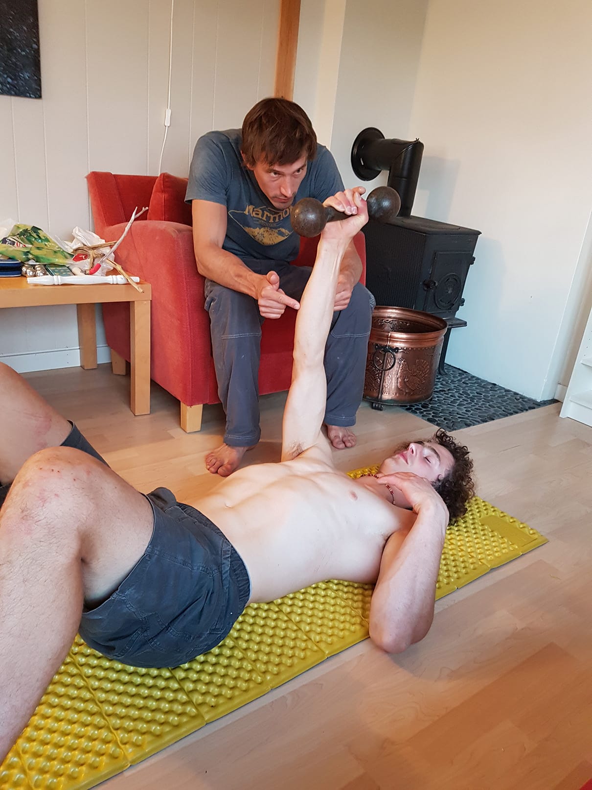 The other part is focusing on not to loose too much of the performance. But well, here it’s getting tricky right? Adam can not do his exercises, with the exception of his stretching (one thing he kept doing). So what can you do? Your brain is the boss. We worked on not loosing his neurological patterns, activating his movement engrams (see video). Without any weight of course. But therein lies the other possible little thing you can do, in order not to loose too much of the specific built up skills.