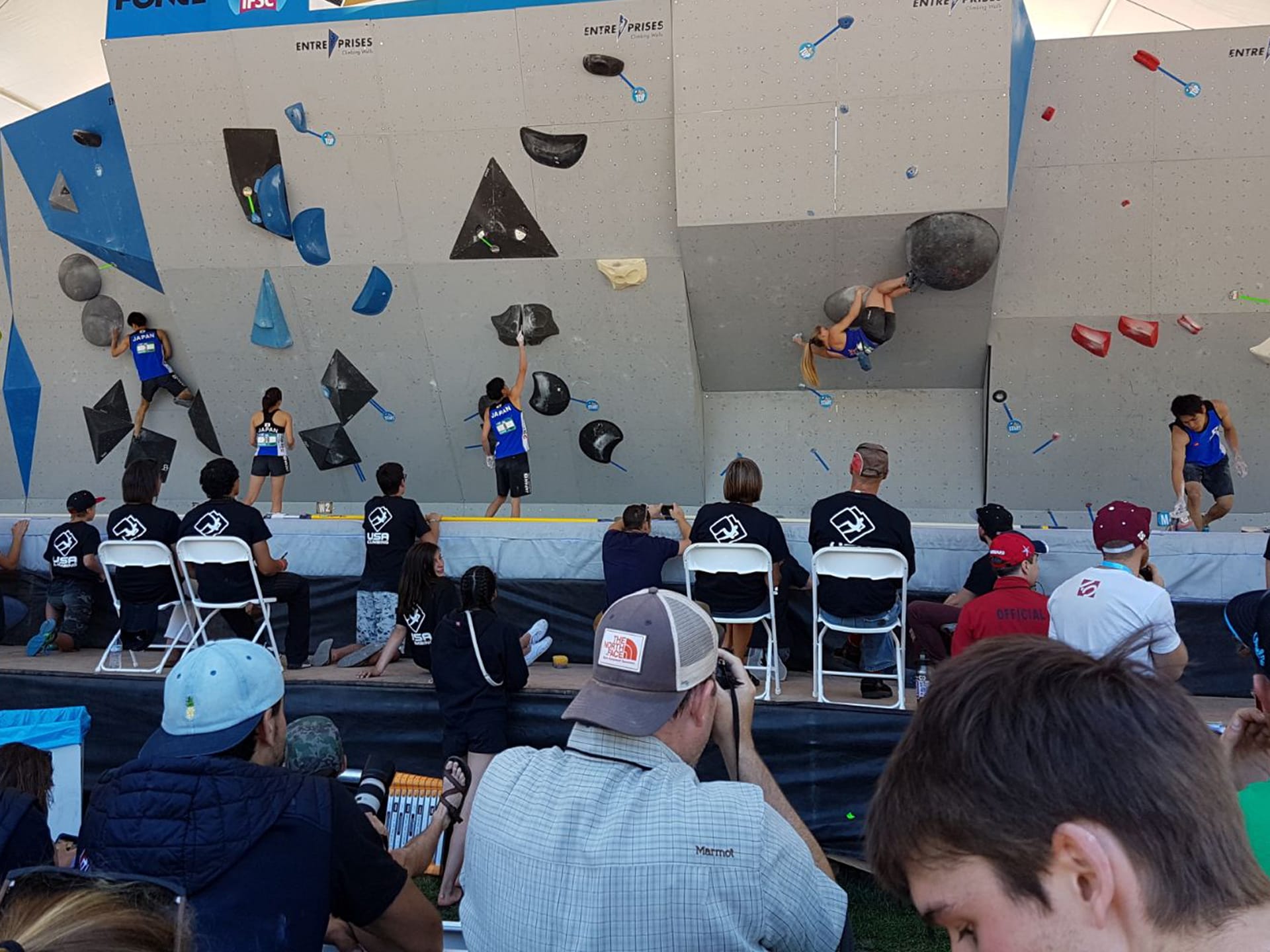 The town of Vail is situated at around 2500m altitude, the air is very dry and with the sun out it can be very hot. All this, the jetlag and quite a high bouldering wall result in special conditions. So Vail seems to be one of the physically most challenging competitions around the season.